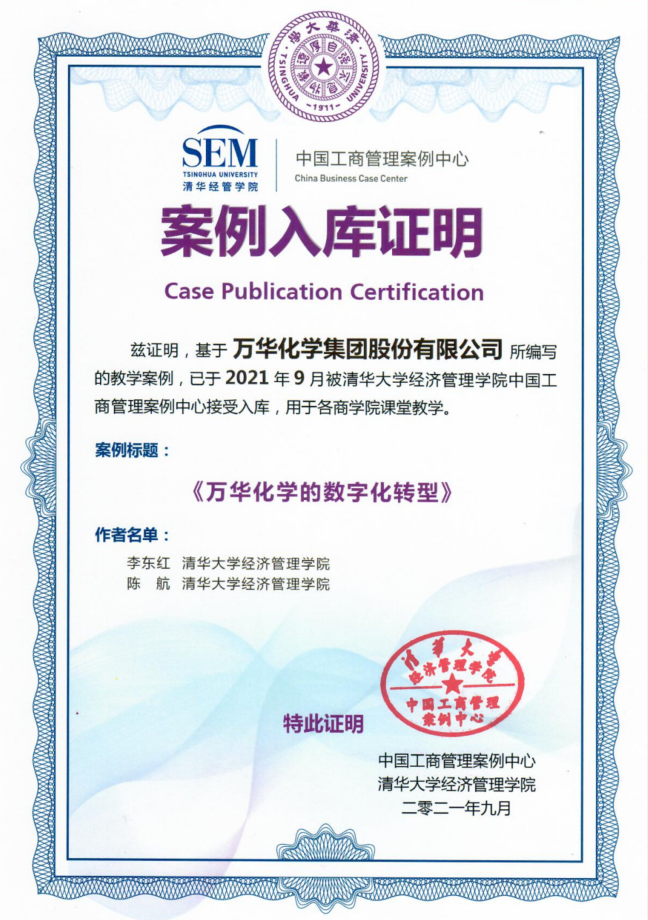 萬(wàn)華化學(xué)數(shù)字化建設(shè)以“創(chuàng)造價(jià)值、引領(lǐng)創(chuàng)新,成為國(guó)際一流的化工數(shù)字化使能者”為愿景,在“業(yè)務(wù)驅(qū)動(dòng)、價(jià)值導(dǎo)向、整體規(guī)劃、分步實(shí)施、用戶滿意”工作理念指導(dǎo)下,多年來(lái)一直致力于建設(shè)全鏈接、全數(shù)據(jù)的智慧企業(yè),已經(jīng)建成經(jīng)營(yíng)管理、智能制造、協(xié)同辦公、生態(tài)圈協(xié)作、智慧決策和基礎(chǔ)設(shè)施六大平臺(tái)。2021年,《萬(wàn)華化學(xué)的數(shù)字化轉(zhuǎn)型》案例被收入清華大學(xué)MBA案例庫(kù),用于各商學(xué)院課堂教學(xué)。