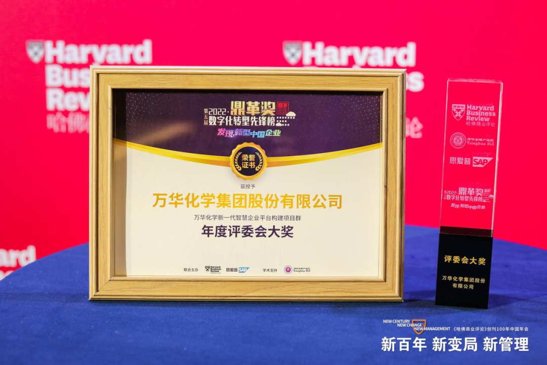 11月9日,在《哈佛商業(yè)評(píng)論》創(chuàng)刊百年中國(guó)年會(huì)上,萬(wàn)華化學(xué)憑借“新一代智慧企業(yè)平臺(tái)構(gòu)建項(xiàng)目群”實(shí)踐,從200余家企業(yè)中脫穎而出,榮獲2022“新型中國(guó)企業(yè)”年度評(píng)委會(huì)大獎(jiǎng)。